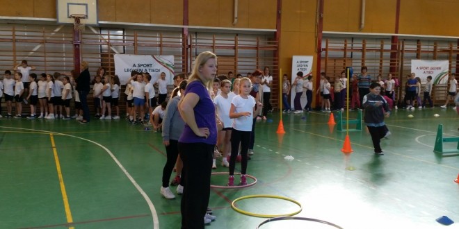 A veszprémi Deák Ferenc Általános Iskola diákjai a VEDAC edzőinek és élsportolóinak segítségével próbálhatták ki az új kölyökatlétikai eszközöket.